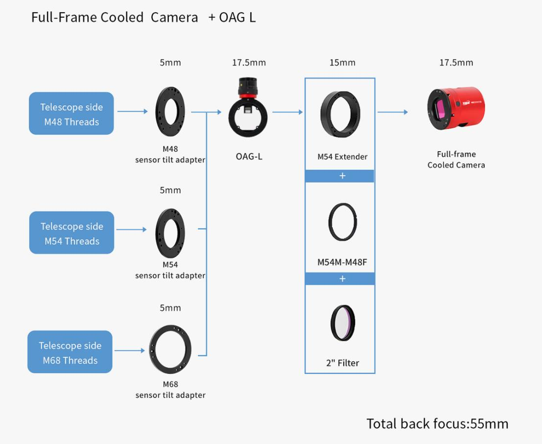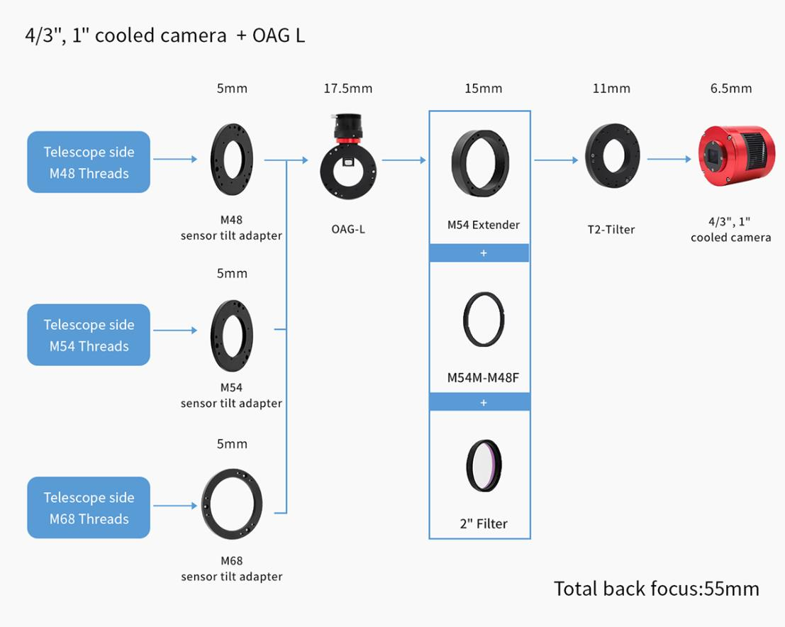 Note: This setup requires removing the M42 sensor tilt adapter that comes with the camera. If you have an M68 OAG, it can also be used as a replacement for the OAG -L.[/caption]