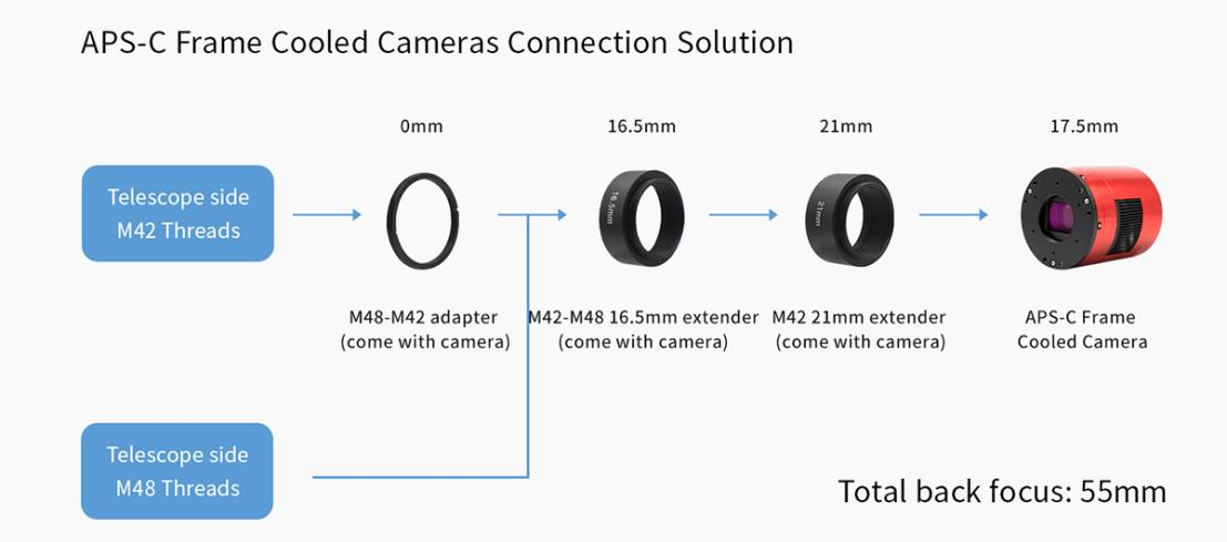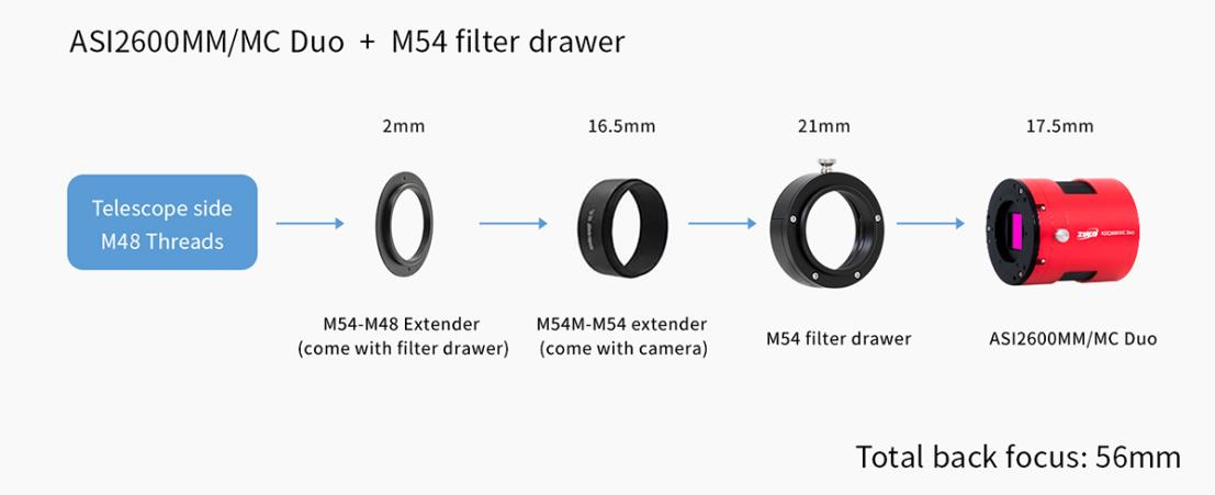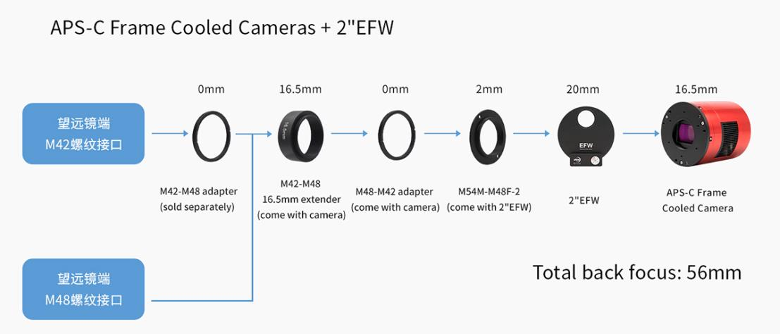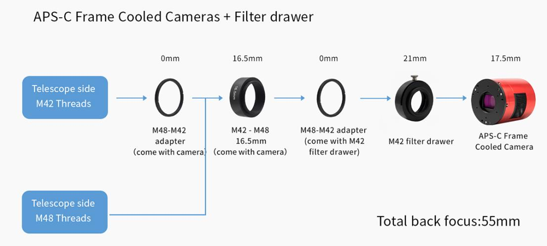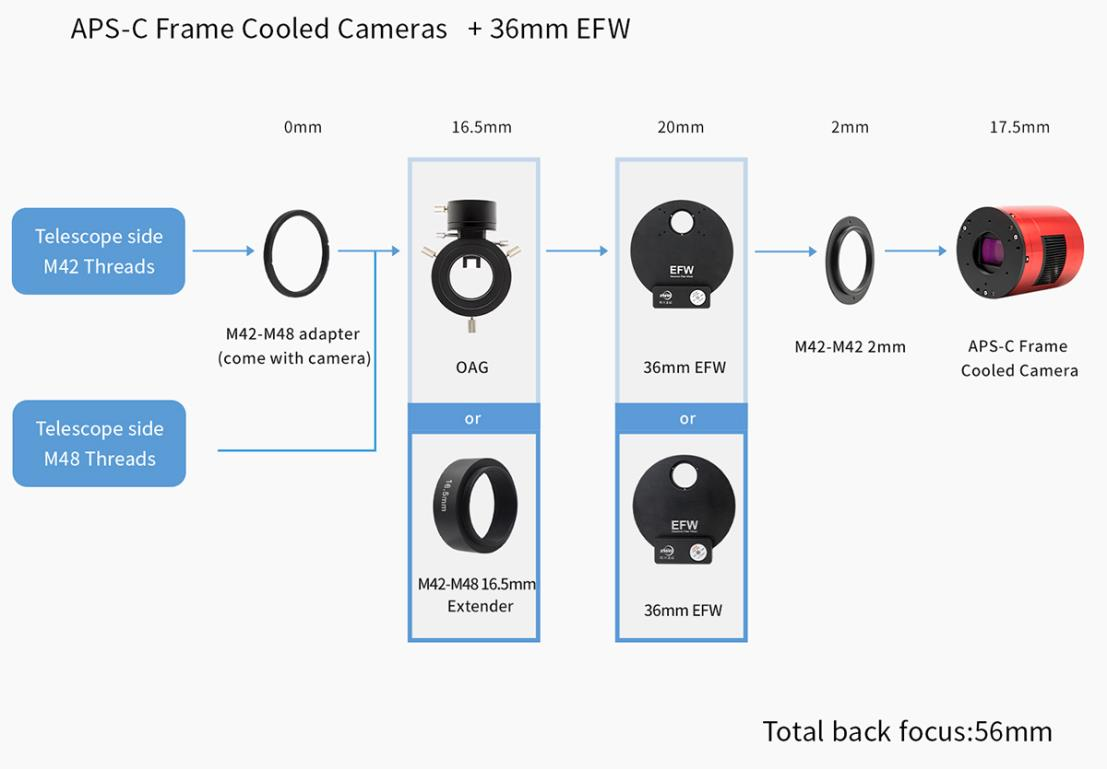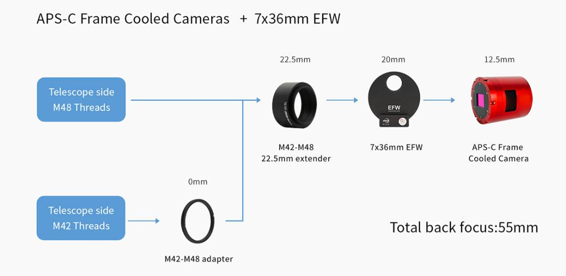 Note: For APS-C frame cooled cameras, ZWO recommend using 2" or 36mm filter wheels or filter drawers. Smaller filters may cause vignetting or frame obstruction.