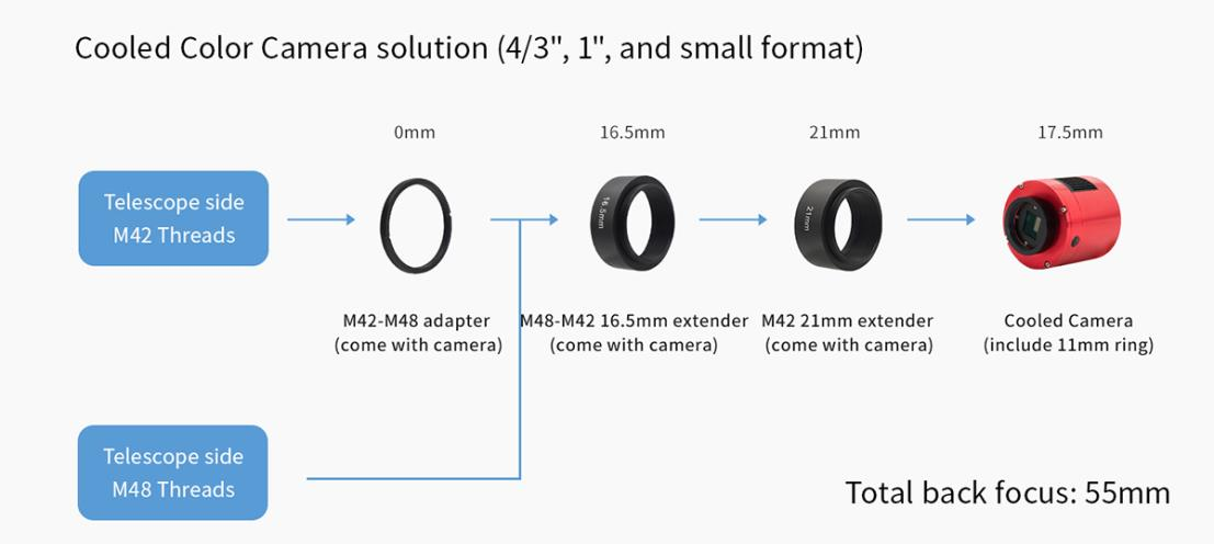 Note: This setup requires removing the sensor tilt adapter that comes with the camera. It is only compatible with telescopes featuring an M48 or M42 thread on the telescope side. The M42M–M48F 22.5mm extender needs to be purchased separately.[/caption]